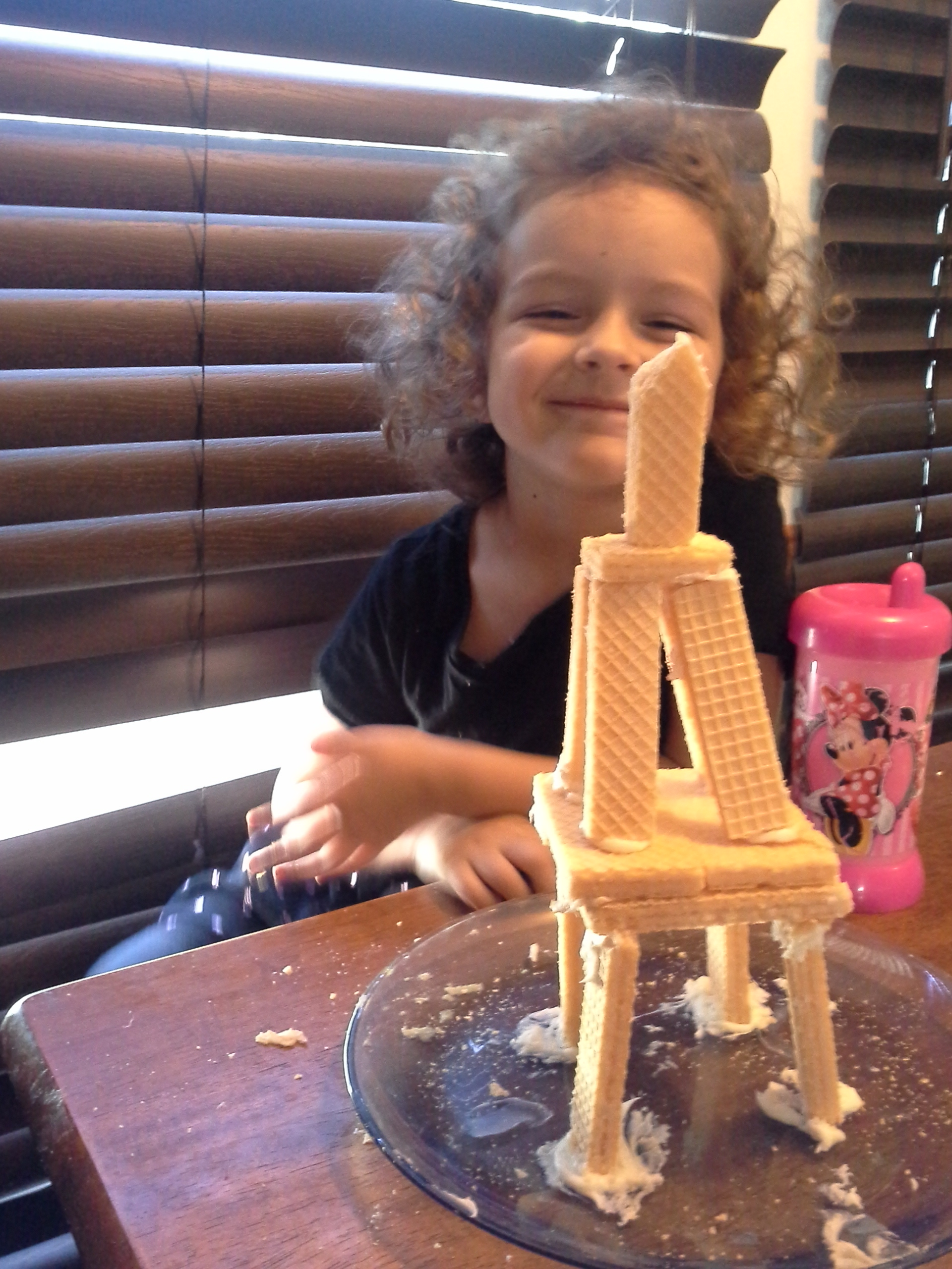They certainly didn’t turn out fancy (or proportionate) but we had fun making them and it helped the girls to learn a little more about the body (they especially like blowing air into the “lungs”). Here is Paige with her Eiffel tower built out of sugar wafers and frosting. This was all of their favorite craft of the week (of course).